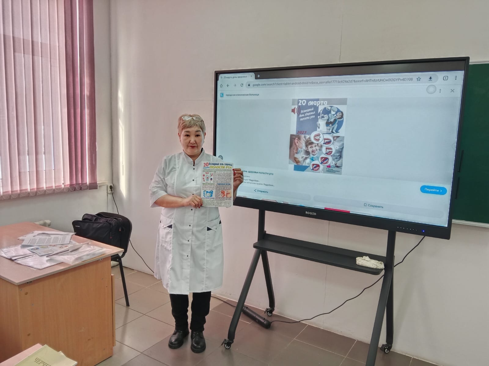 Всемирный день здоровья полости рта отмечается ежегодно 20 марта. В Аулиекольском сельскохозяйственном колледже было проведены лекции со студентами 1 и 2 курсов о важности гигиены для здоровья зубов и всего организма. Регулярно посещать стоматолога, питаться и чистить зубы, чтобы предотвратить кариесы болезни десен.